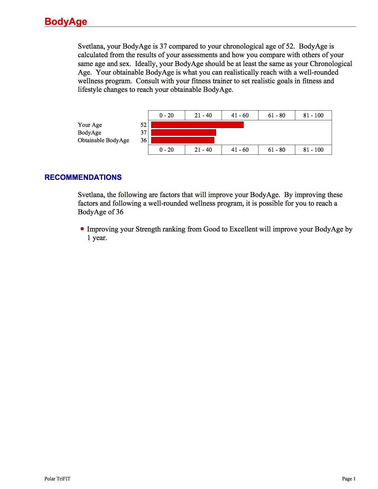 Our Polar Bodyage Assessment uses a combination of assessments (strength, flexibility, cardio-vascular (VO2), body composition, girth measurements and nutrition) to calculate your body’s present biological age compare to your chronological age.